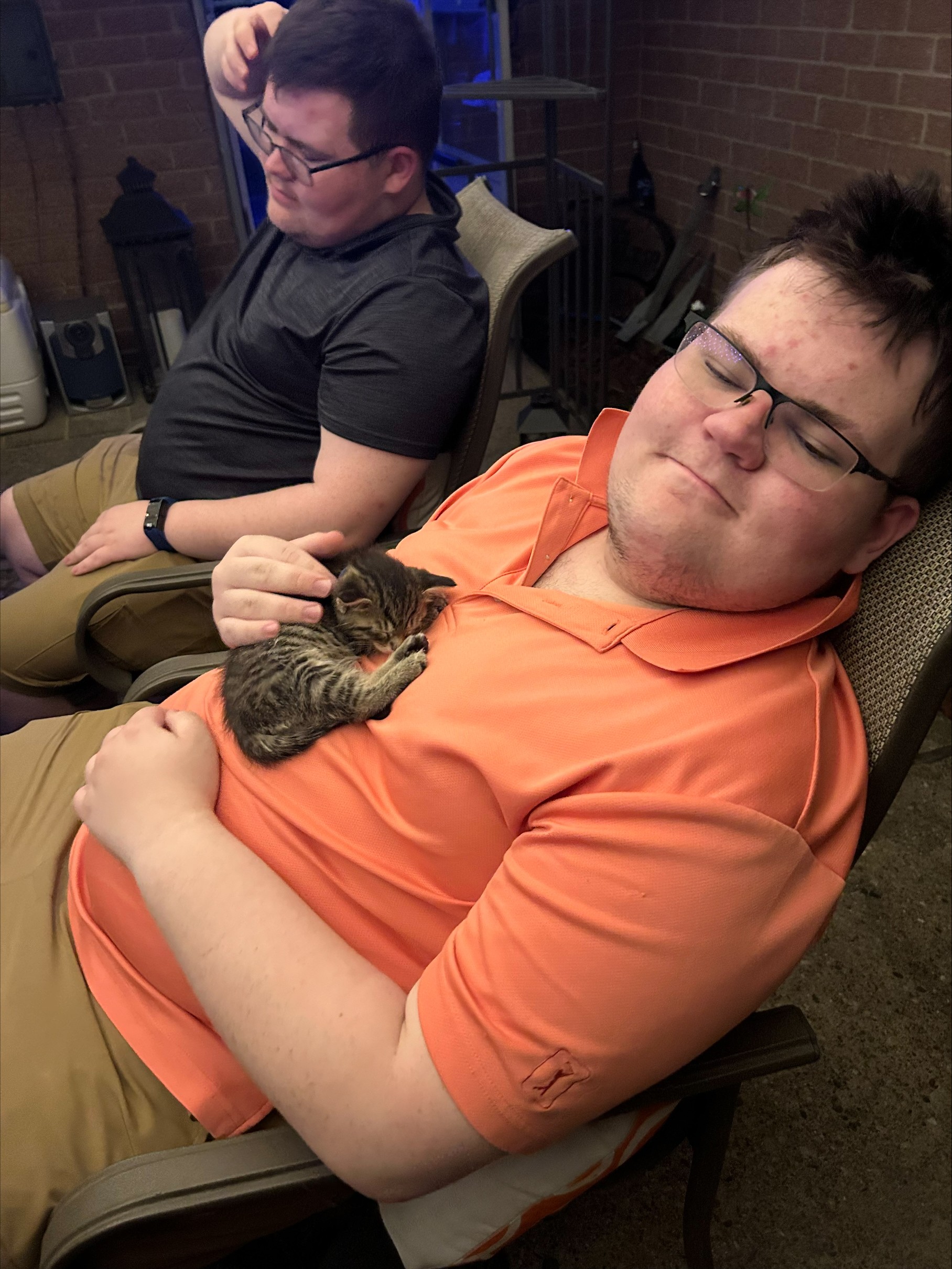 An image of Coco Bean falling asleep on Blake's lap during a party.